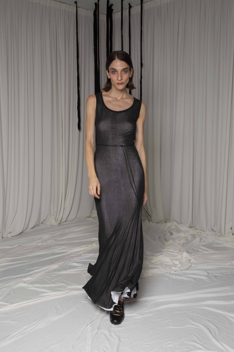 This super elegant backless long dress is made of two different fabrics both in texture and color. The wide round neckline and the mermaid tail finishing give an extra dose of chicness.