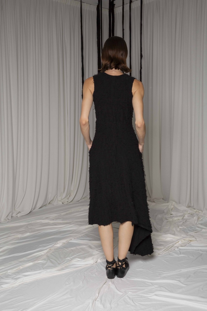 Asymmetric midi dress totally made of the distressed cotton fabric featuring a v-neck, pockets, a tide waist and asymmetric finishing. Super chic and elegant, a timeless piece.