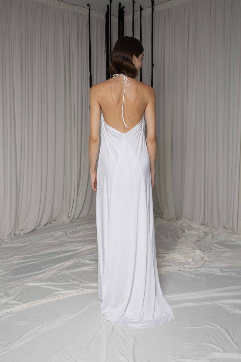 Ethereal summery maxi dress made of super soft spandex featuring a low v-neck, spaghetti stripes, open back and floor-length finishing. The mess effect cotton in the front of it makes it contemporary and unique.