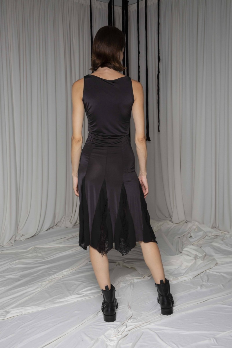 Fantastic body hugging midi dress made of spandex and cotton details. Featuring a wide neckline, a-line and unique mess effect details. Super chic, stylish, classic and contemporary.