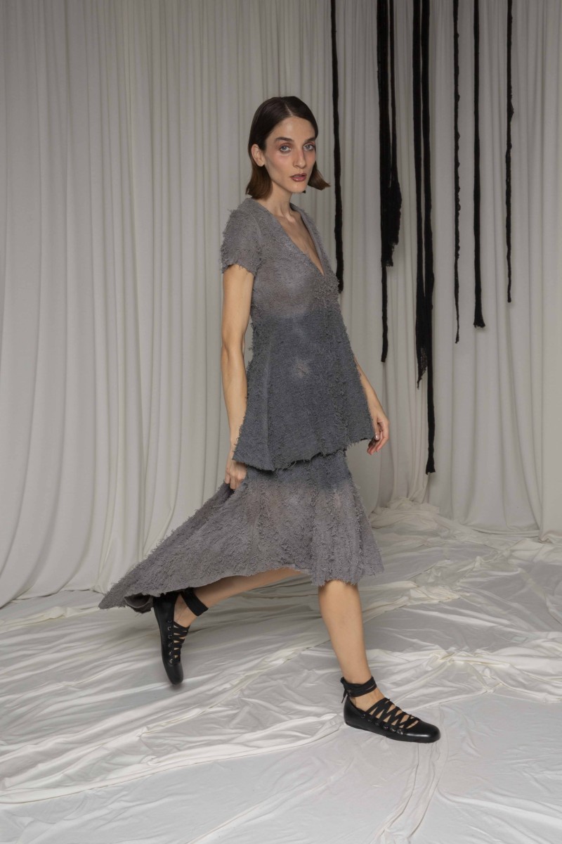 Top made of distressed cotton fabric and hand dyed in different shades of grey. V-neck, short sleeves and a-lone cut. Easy and unique.