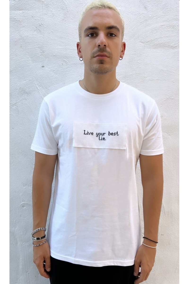 Unisex embroidery t-shirt "LIVE YOUR BEST LIE". Features a neckline and short sleeves.