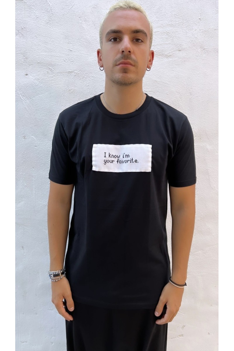 Unisex embroidery t-shirt "I KNOW I'M YOUR FAVORITE". Features a neckline and short sleeves.